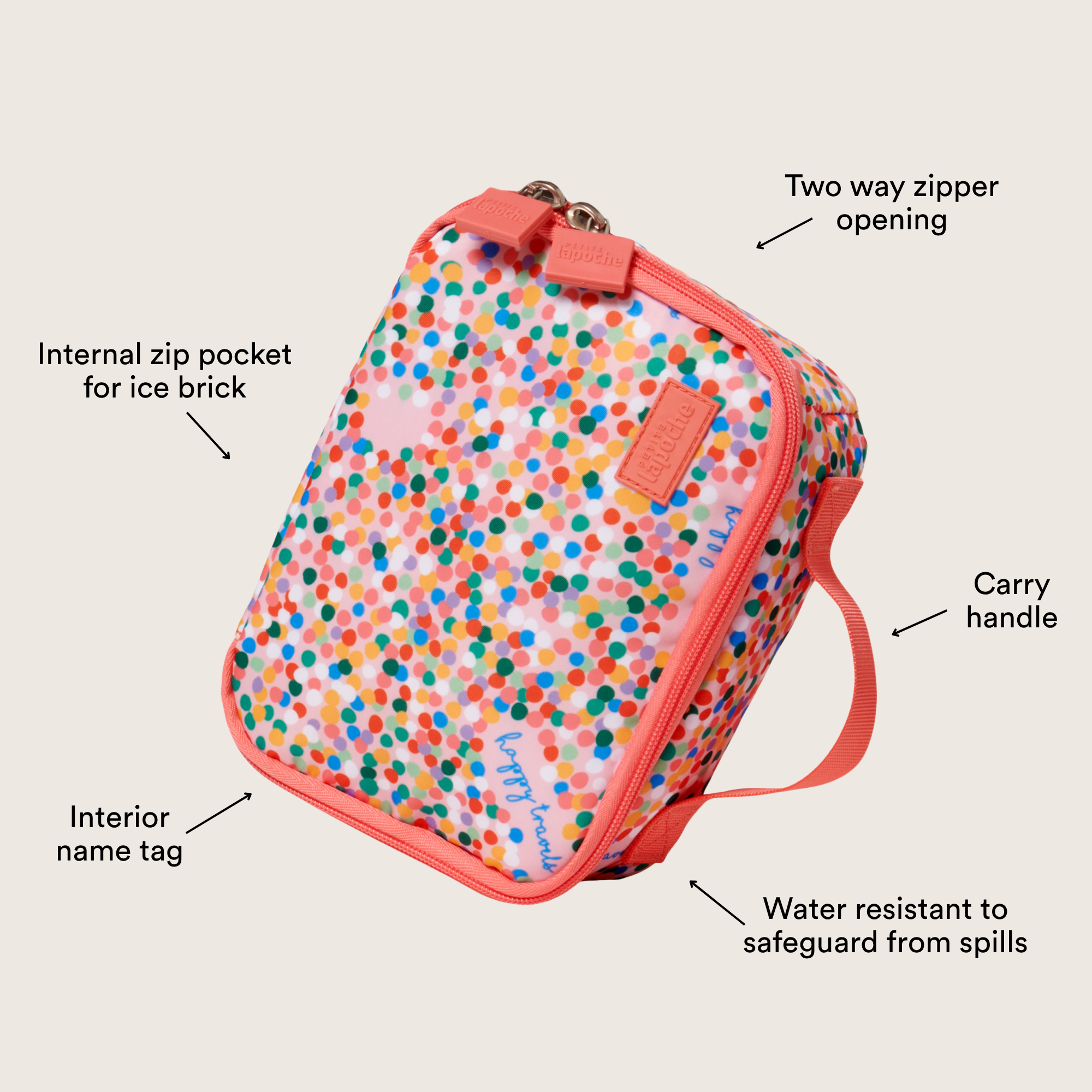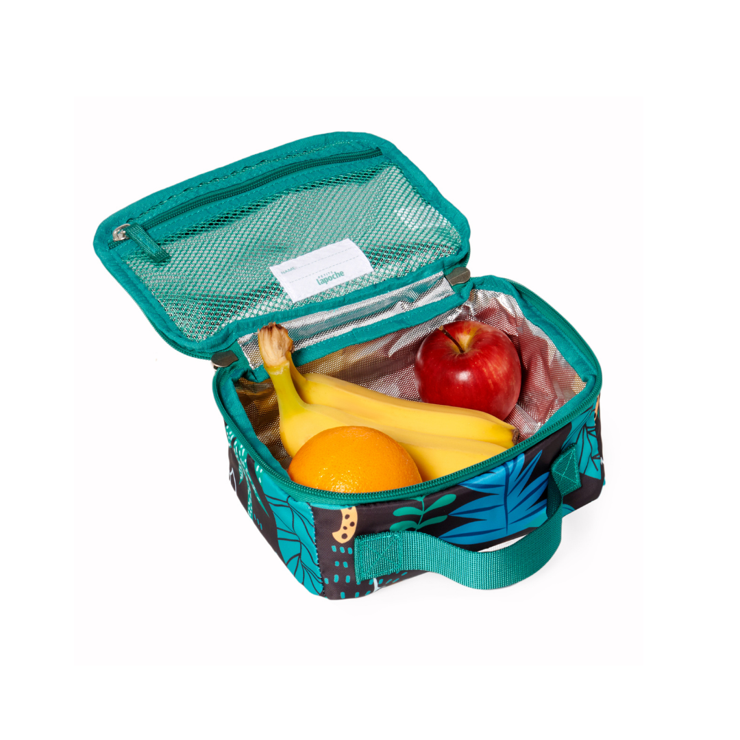 Cool inside and out, this Lunch Tote is just the right size for a sandwich, snacks (the good snacks please) and a drink bottle. It includes an insulated lining, hand strap, and an internal zippered mesh pocket for an ice pack or small storage.