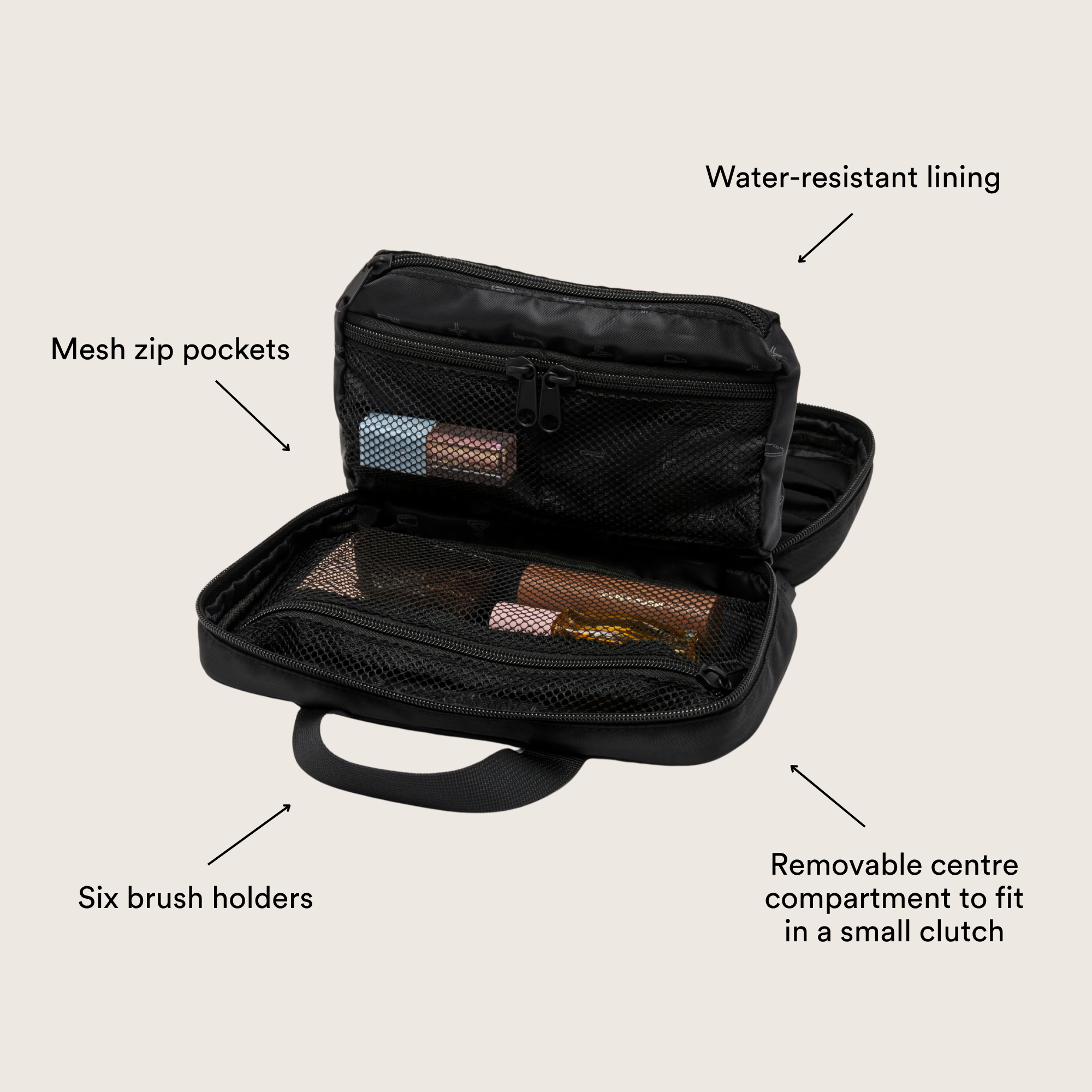 Thoughtfully designed with space for all your cosmetics and brushes, this little beauty bag keeps everything organised, protected and ready when you are. For quick touch ups on the go, the detachable central pocket slips easily into your handbag or clutch. Compact and clever, it's the perfect fit for both carry-on and checked luggage.
